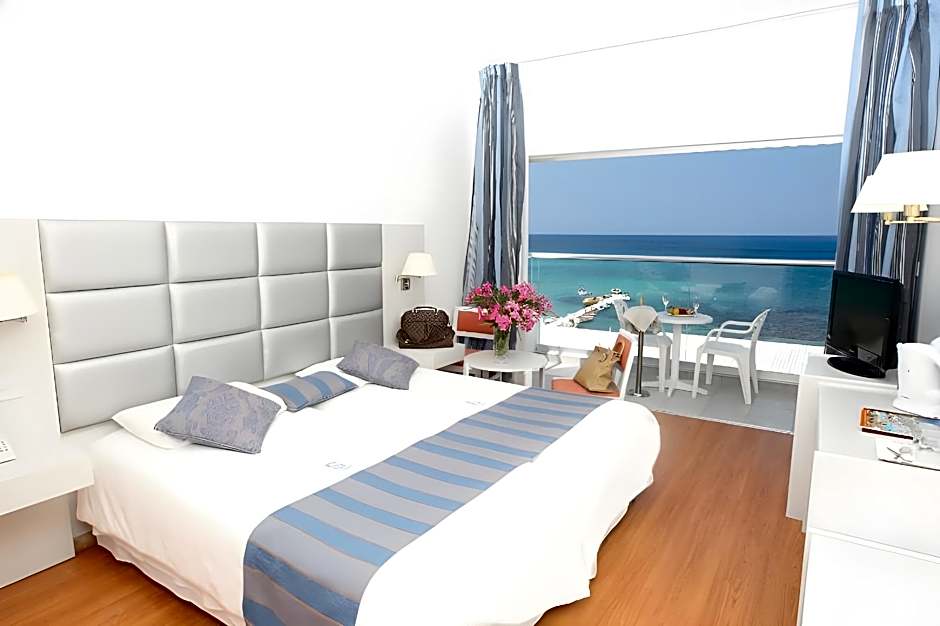 Opening to a furnished balcony with side sea views, this modern room includes air conditioning and a flat-screen TV.